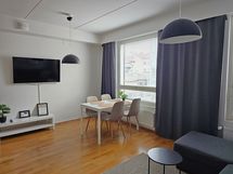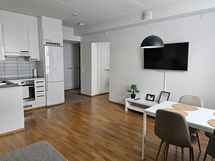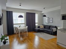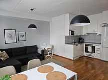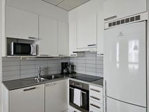 - Keittiön varusteet: Jääkaappipakastin, erillisuuni, liesituuletin, liesi ja astianpesukone. Työtason materiaali: Laminaatti.