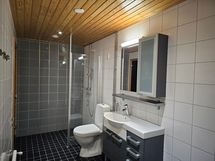 - Pesutilojen varusteet: WC-istuin, suihku, suihkuseinä, pesukoneliitäntä, lattialämmitys, allaskaappi, peilikaappi ja pesuallas.