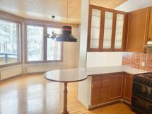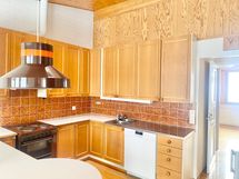 - Keittiön varusteet: Jääkaappipakastin, liesi, liesituuletin ja astianpesukone. Liesi: Valurautaliesi. Työtason materiaali: Laminaatti.