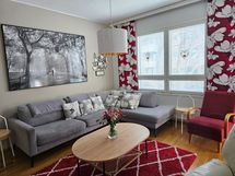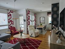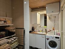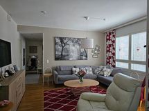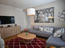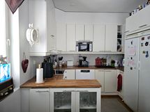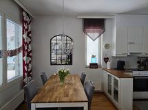 - Keittiön varusteet: Jääkaappi, erillinen pakastin, uuni, liesi, liesituuletin, astianpesukone ja vitriinikaappi. Liesi: Induktioliesi. Työtason materiaali: Laminaatti.