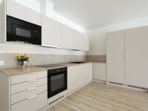Varusteet: Jääkaappi, Pakastin, Astianpesukone, Astianpesukoneliitäntä, Integroidut kodinkoneet. Työtaso: Laminaattitaso. Liesi: Induktioliesi, Erillisuuni, Liesituuletin, Mikroaaltouuni. Ideal-Keittiöt kalusteet, Led-valaistus keittiössä
