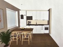- Keittiön varusteet: Jääkaappipakastin, uuni, liesi ja liesituuletin. Liesi: Sähköhella. Työtason materiaali: Laminaatti. Myyjä remontoi keittiön kustannuksellaan ja uusi keittiö sisältyy ilmoitettuun hintaan. Saat halutessasi kalusteiden havainnekuvat välittäjältä. Remontti valmistuu arviolta huhtikuun 2026 loppuun mennessä.