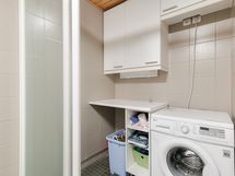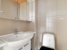 - Varusteet: suihku, suihkuseinä, lattialämmitys, kylpyhuonekaapistot, kiinteät valaisimet, allaskaappi, pesukoneliitäntä. Siisti kylpyhuone varusteineen toimii myös kodinhoitohuoneena. Lattiassa myös viemärivaraus wc-istuimelle. WC: Erillinen wc varusteineen ja toiselle istuimelle varaus kylpyhuoneessa. Varusteet: lattiaan asennettu WC, allaskaappi, bidee, peilikaappi