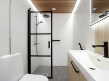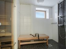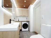 - Varusteet: WC, suihku, suihkuseinä, lattialämmitys, pesukoneliitäntä, allaskaappi, kylpyhuonekaapistot, peili. Iso laajennettu ja hyvin varusteltu kylpyhuone/kodinhoitohuone/wc. WC: Kylpyhuoneen yhteydessä. Varusteet: lattiaan asennettu WC, bidee