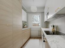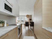 - Varusteet: integroitu astianpesukone, jääkaappi, pakastin. Työtaso: laminaattitaso. Liesi: liesituuletin, induktioliesi, erillisuuni, mikroaaltouuni. Upea keittiö varusteineen. Integroidut kodinkoneet.