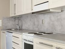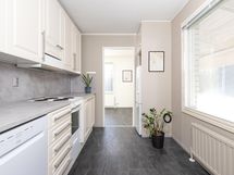 Jääkaappipakastin, sähköliesi, liesituuletin, astianpesukone, kaapistot, kiinteät valaisimet, pöytätasojen materiaali laminaatti.
