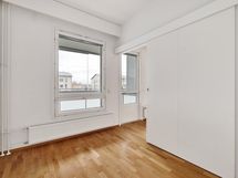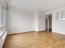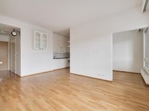 Tämä valoisa asunto on yhtiöjärjestyksen mukaan yksiö, mutta pohjaratkaisunsa ansiosta se toimii käytännössä pienen kaksion tavoin ja tuntuu neliöihinsä nähden yllättävän tilavalta.