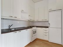 Jääkaappipakastin, sähköliesi, liesituuletin, kaapistot, kiinteät valaisimet.