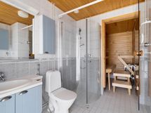 Sauna, sähkökiuas, kylpyhuone, suihku, suihkuseinä, peilit, kaapit, allaskaappi, pesukoneliitäntä, lattialämmitys, kiinteät valaisimet.