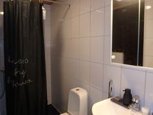 Pesutilojen varusteet: WC-istuin, suihku, pesukoneliitäntä ja pesuallas.