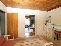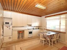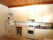 Työtasot: laminaatti. Kylmäsäilytys: jääkaappi. Varustus: liesituuletin / suodatin. Keittiössä valurauta liesi
