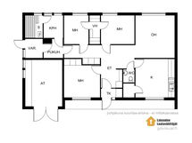 Kohteessa on neljä huonetta, keittiö, sauna sekä vaatehuone, joten tilaa riittää hyvin esimerkiksi lapsiperheelle. Pohjaratkaisu on käytännöllinen ja suuret ikkunat tuovat runsaasti luonnonvaloa sisätiloihin.