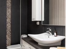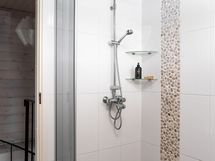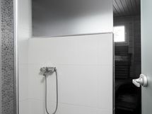 - Varustus: suihkuseinä, lattialämmitys, suihku, kiinteät valaisimet. Varustus: lattialämmitys, peilikaappi, bidee-suihku.