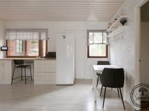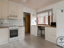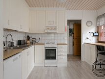 Liesi: sähköliesi. Työtasot: laminaatti. Kylmäsäilytys: jää/viileäkaappi. Varustus: astianpesukone, liesituuletin / hormi.