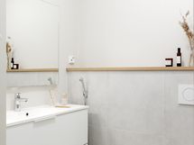 - Varustus: suihkuseinä, lattialämmitys, wc-istuin, suihku, peili, kiinteät valaisimet. Varustus: lattialämmitys, lattiakaivo, bidee-suihku.