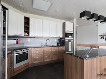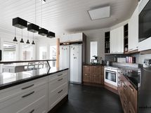- jääkaappi, pakastin, induktiotaso, erillisuuni, liesituuletin, jääkaappi, pakastin, mikroaaltouuni, kivitasot, saareke.