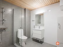 Sauna, sähkökiuas, erillinen wc, suihku, peilikaappi, allaskaappi, pesukoneliitäntä, lattialämmitys.