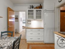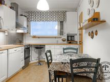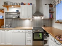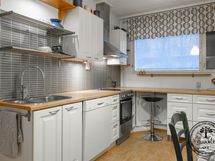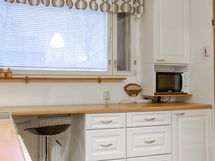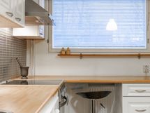Liesi: erillisuuni. Työtasot: laminaatti. Kylmäsäilytys: jää/viileäkaappi. Varustus: astianpesukone, liesituuletin / hormi. Keittiön yhteydessä "kylmäkomero".