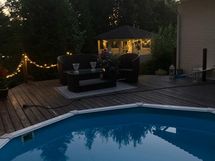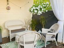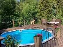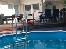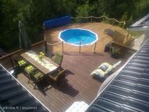 - Asunnossa on terassi. Todella iso terassi takapihalla, jossa uima-allas sekä huvimaja