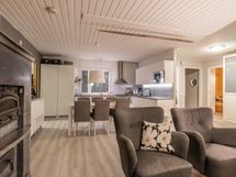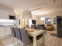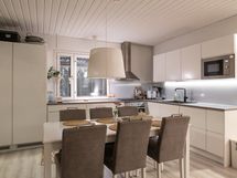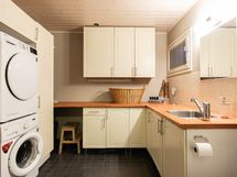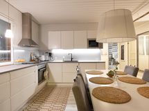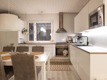 - Keittiön varusteet: Jääkaappi (integroitu), erillinen pakastin (integroitu), liesituuletin (hormiin), liesi, erillisuuni, mikroaaltouuni (integroitu) ja astianpesukone (integroitu). Liesi: Induktioliesi. Työtason materiaali: Laminaatti.
