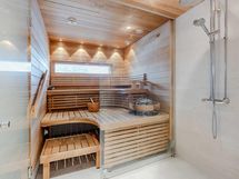 - Kylpyhuone, sauna, erillinen wc x 2. Saunaosastokokonaisuudessa lasiseinäinen sauna, suihku, kodinhoito-osuus ja wc- tila. Tilat kokonaan laatoitettu, saunassa pilarikiuas. Eteisen yhteydessä erillinen wc-tila, joka on kokonaan laatoitettu.