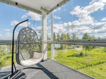 - Todella iso lasitettu parveke, jossa ilmalämpöpumpun ulkoyksikkö. Laskosverhot.. Parvekkeen suunta: kaakko