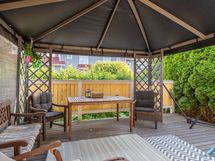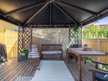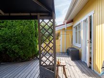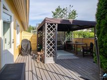 - Takapihalla on iso suojaisa terassi, joka isolta osalta katettu kauniilla pergolalla. Takapihalta on kulku päättyvälle tielle, josta suora pääsy huippu hyviin ulkoilumaastoihin.