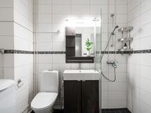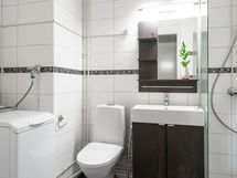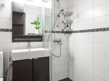 Kylpyhuoneessa on suihku, suihkuseinä, peilikaappi, allaskaappi, pesukoneliitäntä ja kiinteät valaisimet peilikaapin yläpuolella.