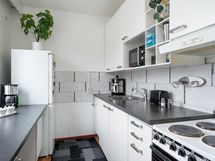 Keittiössä on jääkaappipakastin, sähköliesi, liesituuletin, astianpesukone, kaapistot ja kiinteät valaisimet välitilassa.