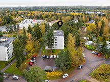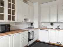 Varustus: jääkaappi/pakastin (Samsung), keraaminen liesi/uuni, liesituuletin, astianpesukone (Point), kiinteät valaisimet. Tasot laminaatti. Lattiassa parketti. Seinissä välitilalaatta, maali.