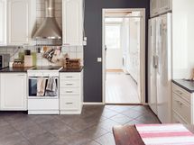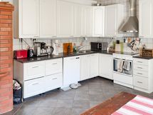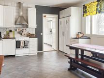 Jääkaappi, pakastekaappi, lattialiesi, liesituuletin, leivinuuni, astianpesukone, kaapistot, kiinteät valaisimet.