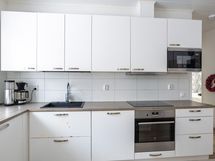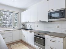 Jääkaappi, pakastekaappi, erillisuuni, induktioliesi, liesituuletin, mikroaaltouuni, astianpesukone, kaapistot, kiinteät valaisimet.