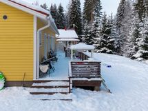 Suojaisa takapiha rajautuu rauhoittavaan metsään, jossa puro solisee ja lenkkipolut kutsuvat liikkeelle vuoden jokaisena päivänä. Talvella pääset pihasta suoraan hiihtoladuille. Laaja terassi tarjoaa täydelliset puitteet rentoutumiseen ja ulkoilmaelämästä nauttimiseen.