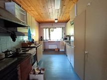 Liesi: muu, puuliesi. Työtasot: laminaatti. Kylmäsäilytys: jenkkikaappi. Varustus: liesikupu, liesituuletin. Kaapistot vastakkaisilla seinustoilla. Päädyssä pöytätaso. Käynti khh/kph.
