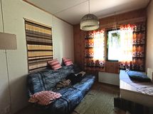 Kuvaus: Hirsiseinä. Muuriseinä maalattu. puukiuas