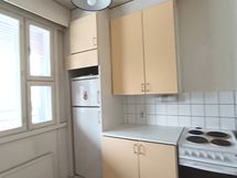Liesi: sähköliesi. Työtasot: laminaatti. Kylmäsäilytys: jenkkikaappi.