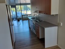 Laminaattitasot, Suuri tiskipöytä, Pesukoneliitos, Sähköliesi, Jääkaappi