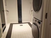 Tasot ja allas valumarmoria. Varustus: pesukoneliitäntä, lattialämmitys, lattiakaivo, bidee-suihku.