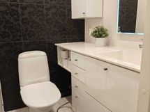 - Pesutilojen kuvaus: Lasitiili seinämää. Varustus: pesukoneliitäntä, lattialämmitys, wc-istuin, suihku, kylpyhuonekaapisto. Erillisen WC:n kuvaus: Tuuletusikkuna.