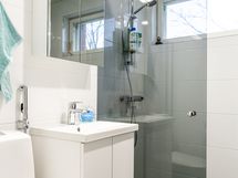 Suihku, Suihkuseinä, Pesukonevalmius, Peilikaappi, Allaskaappi, Laattalattia, Laattaseinä, Avattava ikkuna, Lattialämmitys