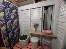 Mökissä on sähköt sekä ulkohuussi (rempattu 2023, vaihdettu mm huussipönttö uuteen). Juomakelpoinen vesi tulee tontin reunaan, tarvikkeisto veden saamiseksi terassille ja huussiin on jo olemassa, mutta ei vielä asennettu. Etualalla mukavankokoinen terassi. Lisäksi huussin yläkerrassa on varastotilaa ja mökin yhteydessä on myös pihavarasto.