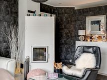 Olohuoneen sydämessä lämpöä ja tunnelmaa tuo varaava takka, ja oleskelutilat jatkuvat sujuvasti ulos – suojaisalle terassille, johon on upotettu heti valmis poreallas.