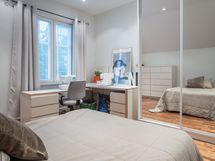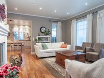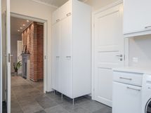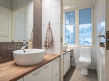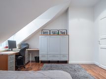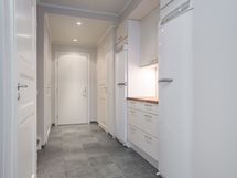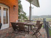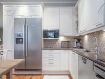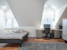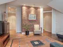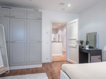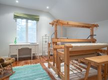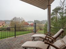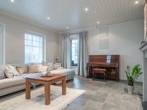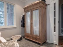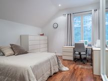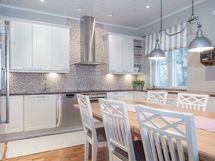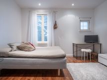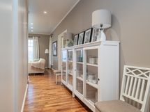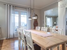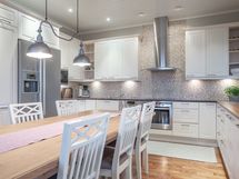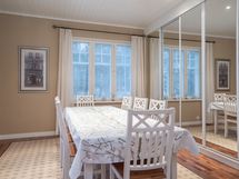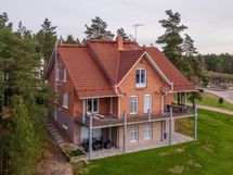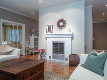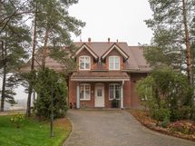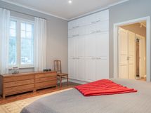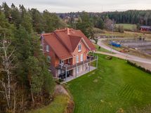 Hulppeat sisätilat kolmessa kerroksessa tarjoavat jopa 7 tilavaa makuuhuonetta. Keskikerroksesta löytyy kivitasoilla varustettu tyylikäs keittiö, josta on kulku myös koko talon levyiselle parvekkeelle. Olohuoneesta erkkerimäiset ikkunat antavat mukavan näkymän ja kaunis manttelitakka tuo lämmintä tunnelmaa. Tästä kerroksesta löytyy myös kaksi makuuhuonetta, joista toinen on erotettu pariovin olohuoneesta ja toimii siten hyvin myös ruokailuhuoneena tai vaikka kirjastona. Talon tyyliin hienosti sopivan sisääntulokuistin vierestä löytyy varsin käytännöllinen arkieteinen vaatehuoneineen.