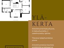 Ylimässä kerroksessa sijaitsee 4 makuuhuonetta ja lisäksi oleskelutila, joka on ollut myös makuuhuonekäytössä. Oleskelutilassa kaunis ranskalainen parveke, tummat kattoparrut ja tunnelmallinen antiikkitiilinen muuriseinä. Tunnelma on hyvin tyylikäs ja kansainvälinen. Kahdessa makuuhuoneessa on vaatehuone ja kaikista löytyy kaappitilaa. Tilava yläkerran kylpyhuone on myös pieni spa-keidas mosaiikkilaatoitettuine kylpyammeineen.