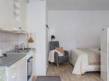 Tämä vaaleansävyinen, hissitalon kolmannen kerroksen 30 m² yksiö vapautuu uuden omistajan käyttöön tarvittaessa muutamassa viikossa, joten tänne pääsee asettumaan kodiksi hyvinkin nopealla aikataululla. Huoneisto sopii pohjaratkaisunsa ansiosta mainiosti niin pariskunnalle kuin yksineläjällekin. Kodin toiseen päähän on tällä hetkellä hyllyllä erotettu makuualkovimainen tila, jolloin kodin keskelle vaaleasävyisen keittiö edustalla on hyvin tilaa ruokapöydälle. Ikkunan ääreen on kalustettu viihtyisä oleskelunurkkaus, jossa on mukava käpertyä sohvalle TV:n ääreen. Tyylikäs kylpyhuone/wc, jossa pyykinpesukoneelle on oma tilansa, on remontoitu vuonna 2024.