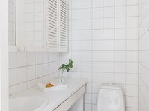 Alakerran wc:ssä on laattalattia, maalatut seinät ja kaakeloitu välitila. Tilassa on allaskaappi, yläkaappi sekä bidesuihku. Varustus: lattialämmitys, lattiakaivo, peilikaappi, bidee-suihku.