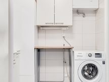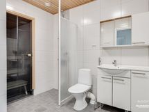 - Pesutilojen varusteet: WC-istuin, suihku, pesukone, pesukoneliitäntä, allaskaappi ja lattialämmitys.