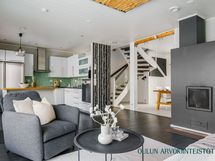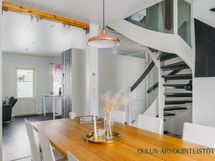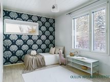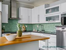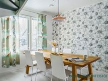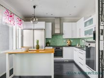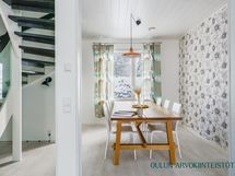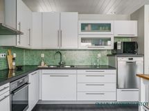 - Varusteet: jääkaappi, pakastin, irralliset saarekkeet, integroitu astianpesukone. Työtaso: laminaattitaso. Liesi: induktioliesi, erillisuuni, liesituuletin hormilla. Valoisa ja tyylikäs avokeittiö yhdistyy luontevasti oleskelutilaan. Vaaleat kaapistot, tumma työtaso ja raikas vihreä välitilalaatta luovat modernin ilmeen ja käytännöllinen saareke tuo lisää työ- ja säilytystilaa. Suuri ikkuna tuo keittiöön runsaasti luonnonvaloa. Ruokailutila: Valoisa ruokailutila tarjoaa hyvin tilaa isommallekin ruokapöydälle. Suuret ikkunat tuovat tilaan runsaasti luonnonvaloa ja kaunis tehostetapetti luo tilaan persoonallista ilmettä. Ruokailutila sijoittuu luontevasti keittiön ja oleskelutilan yhteyteen, mikä tekee arjesta sujuvaa ja yhdessäolosta viihtyisää.