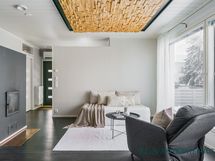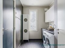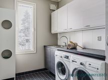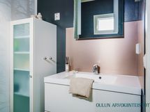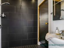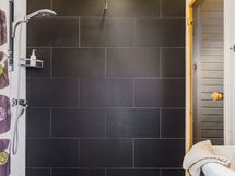 - Varusteet: suihku, peili, allaskaappi, kiinteät valaisimet, WC, lattialämmitys. 1.krs: Tyylikäs kylpyhuone, jossa tumma tehosteseinä tuo tilaan modernia ilmettä ja puupaneloitu katto luo lämpimän tunnelman. Selkeä ja toimiva kokonaisuus arjen käyttöön.