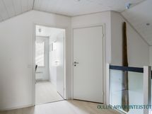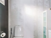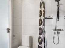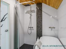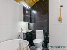 2.krs: Yläkerran kylpyhuoneessa yhdistyvät moderni ilme ja rauhallinen tunnelma. Vaaleat pinnat sekä tumma tehosteseinä luovat tyylikkään kokonaisuuden. Tilassa on suihku, wc sekä kaunis kylpyamme, joka tarjoaa mahdollisuuden rentouttaviin kylpyhetkiin. WC: Alakerrassa erillinen wc-tila.